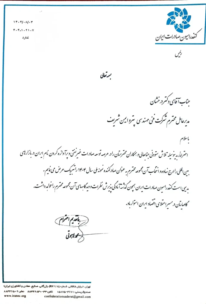 احتراما، بدینوسیله تلاش ستودنی جنابعالی و همکاران محترمتان را در عرصه توسعه صادرات غیرنفتی و پرآوازه کردن نام ایران در بازارهای بین الملی را ارج نهاده و انتخاب آن مجموعه محترم به عنوان صادرکننده نمونه ملی سال ۱۴۰۴ را تبریک عرض می نمایم .